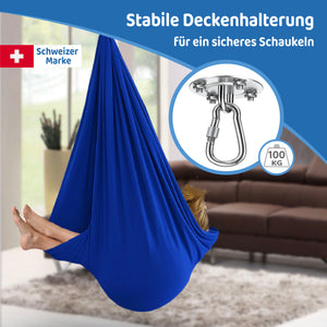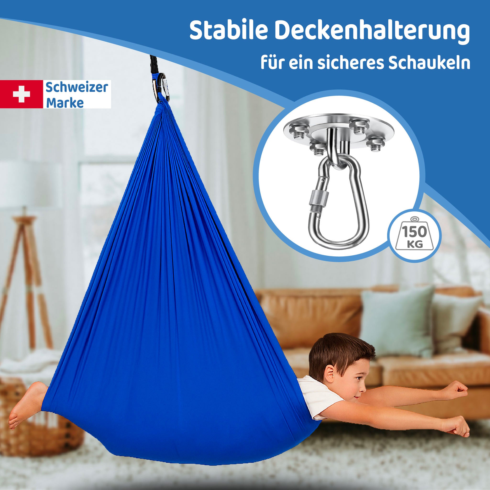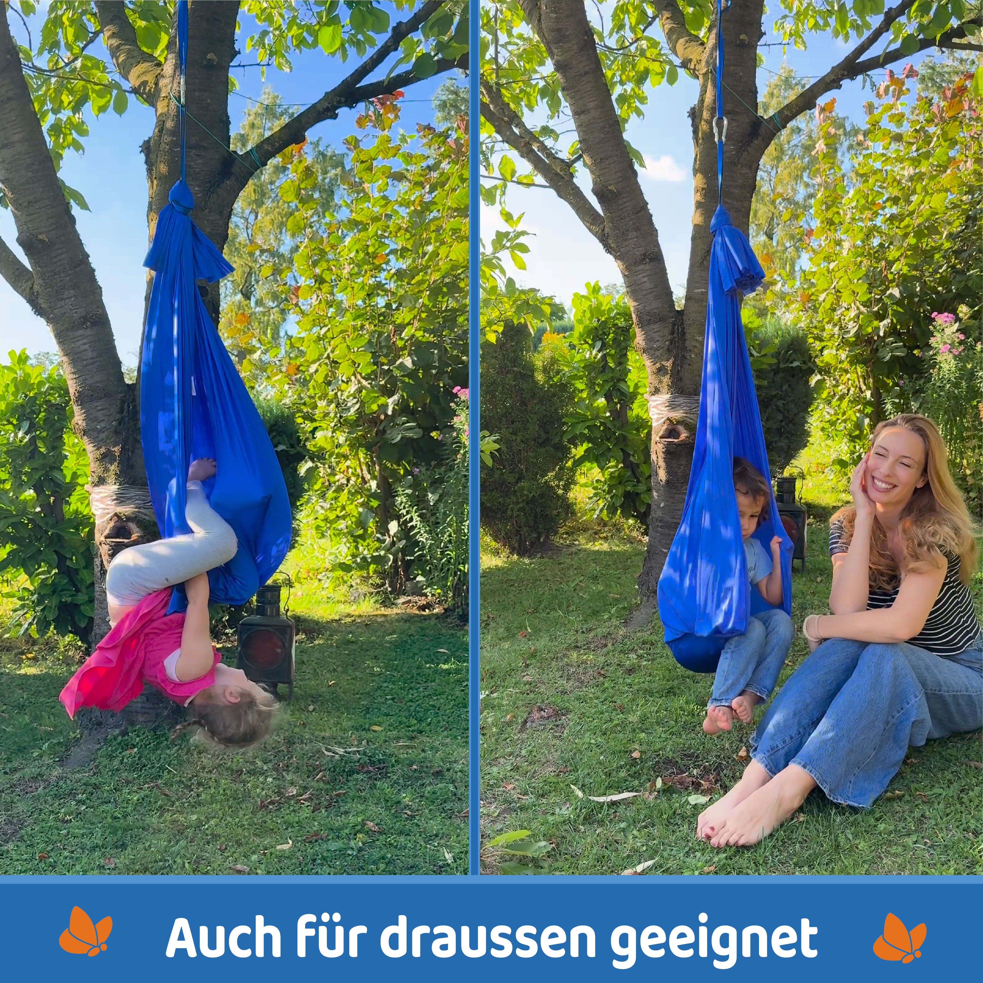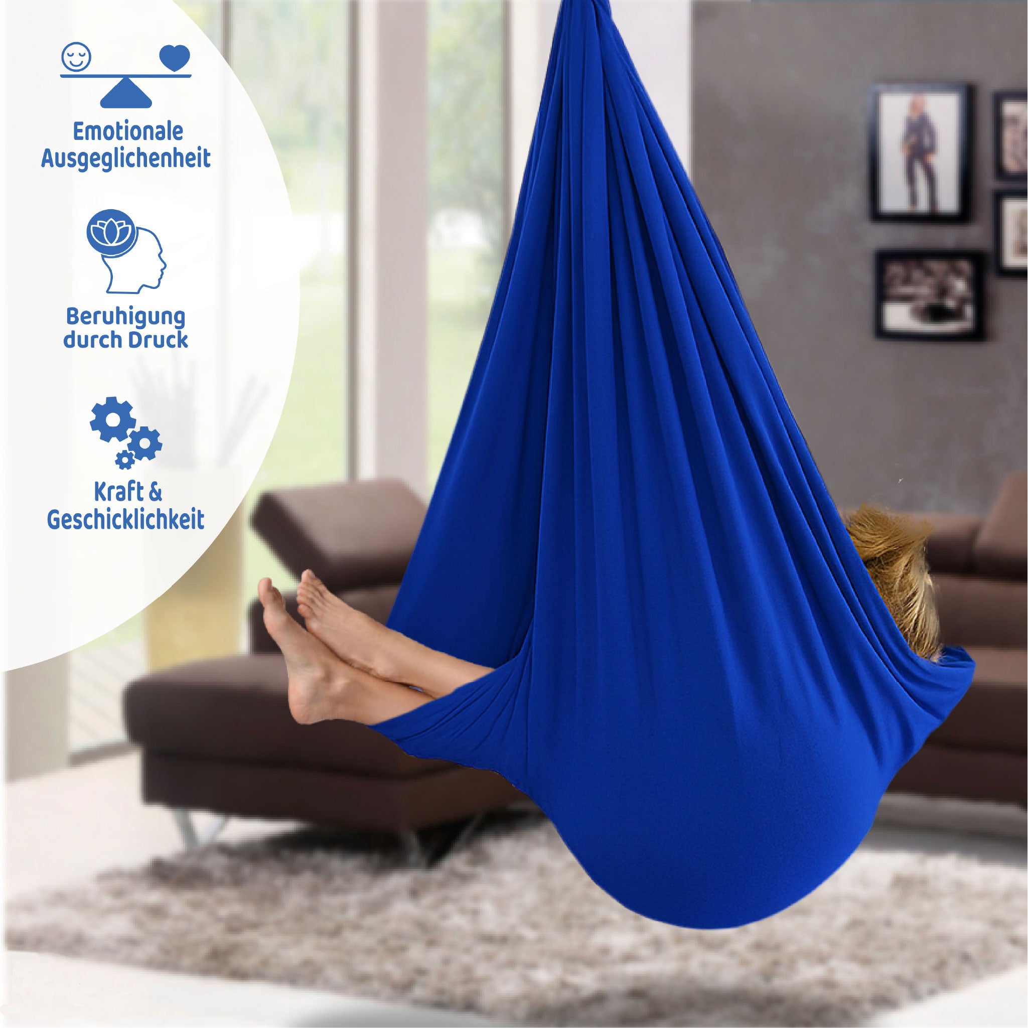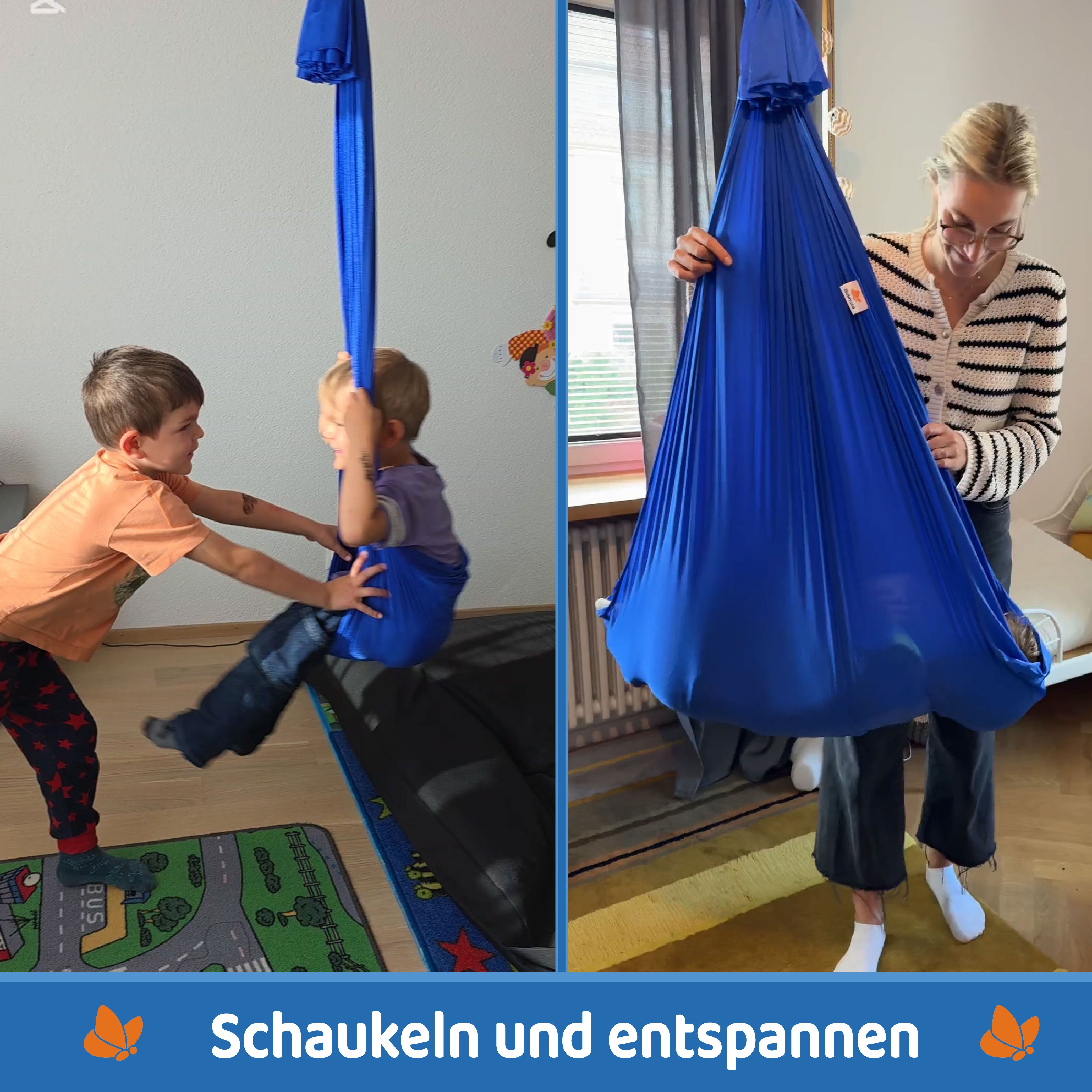 Eine Therapieschaukel ist mehr als nur ein Spielgerät – sie ist ein Ort der Entspannung, der Sicherheit und der Bewegung. Sie ist eine weiche, dehnbare Hängematte, die dein Kind wie eine warme Umarmung umhüllt. Sie kann deinem Kind helfen, sich besser zu konzentrieren, Stress abzubauen und gleichzeitig die körperliche Entwicklung fördern.