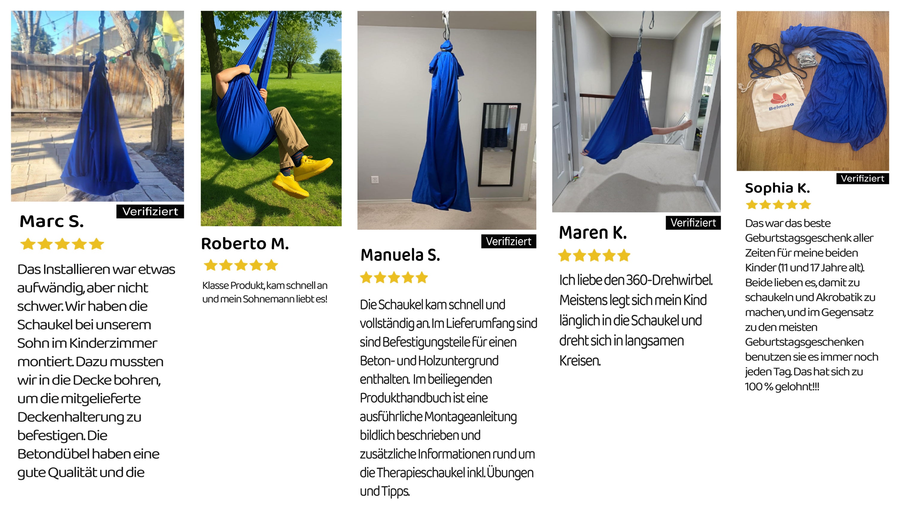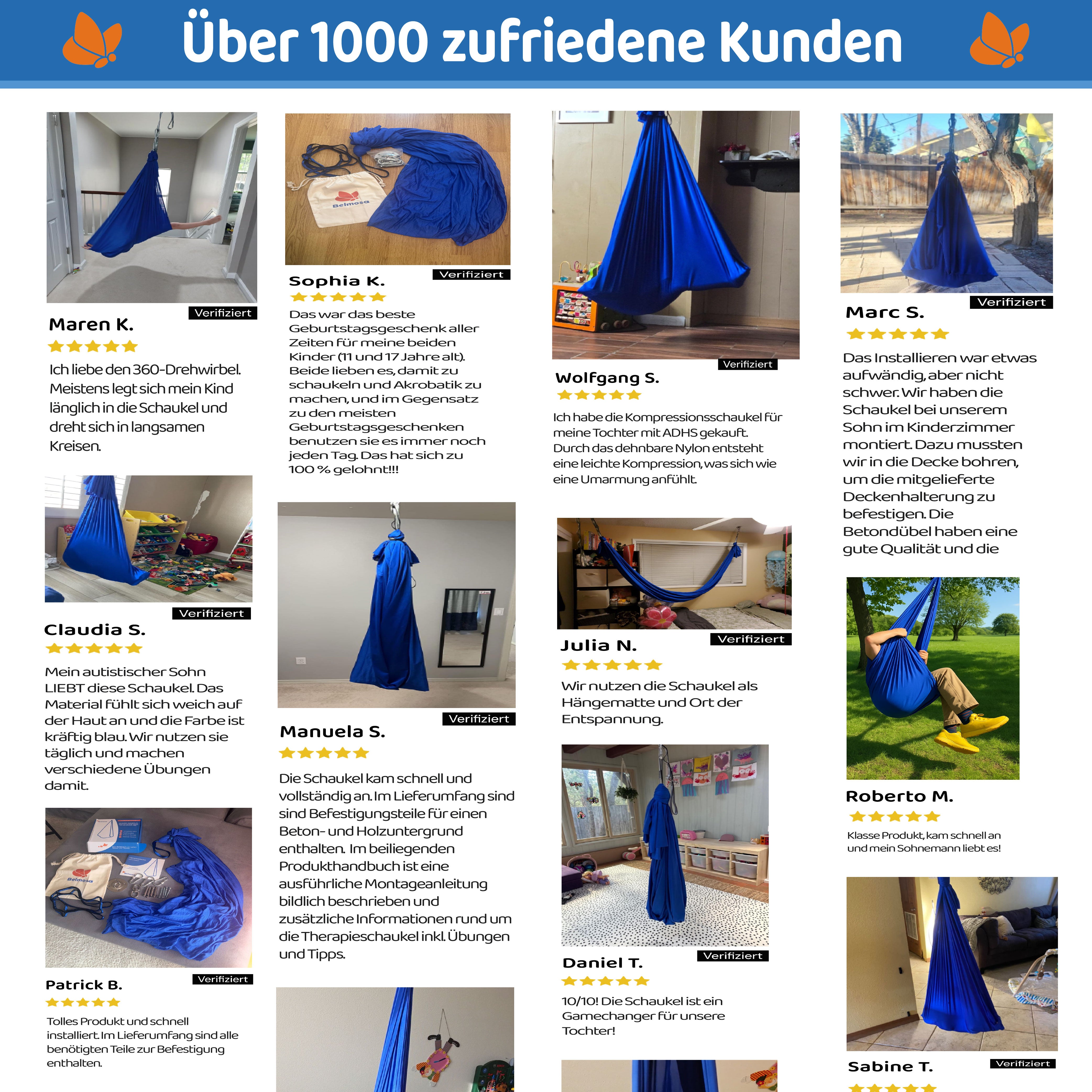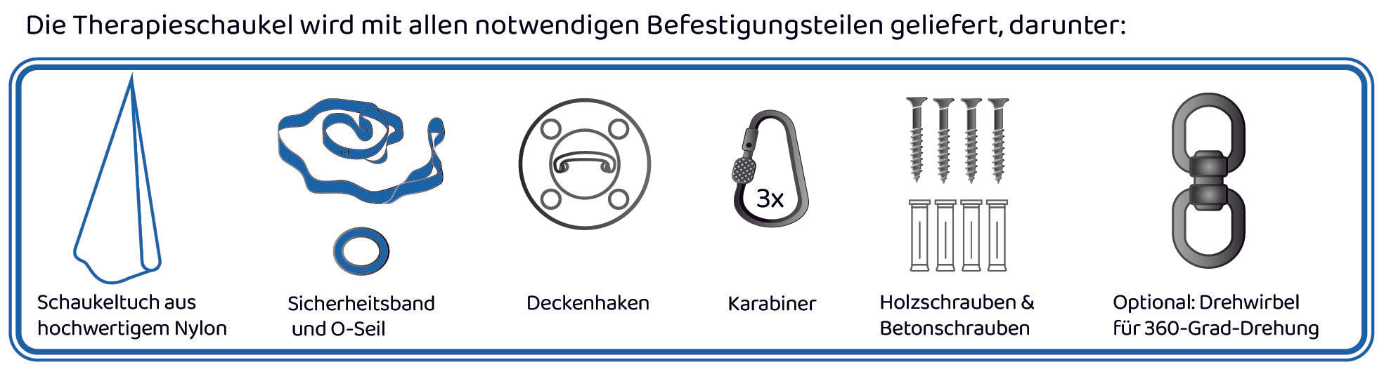 Die Montage ist einfach und schnell. Dank einer klaren, im Paket beiliegenden, Anleitung gelingt die Montage in der Regel in kurzer Zeit, sodass die Therapieschaukel schnell einsatzbereit ist.